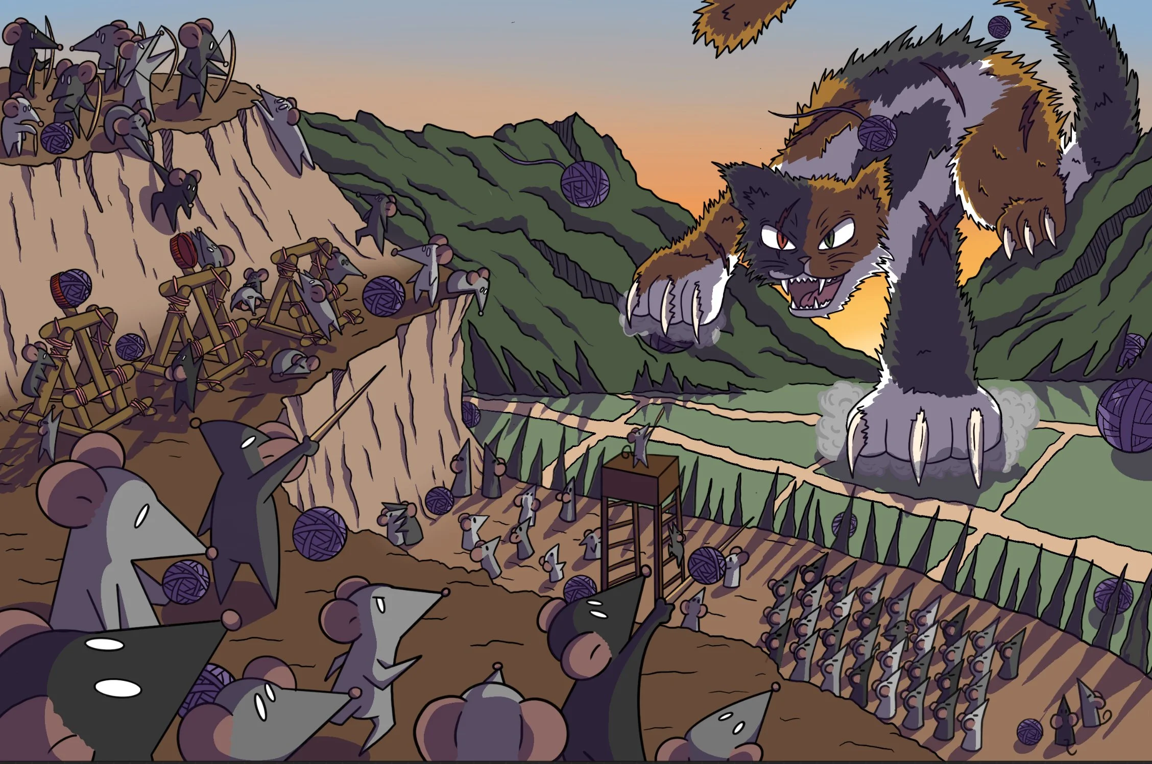 I created a hidden images page for children to young adults. The page depicts a war between mice and a cat. There is an army of mice preparing for war to protect their land from a giant monster cat coming to take over. They have catapults , bows and arrows ready to set their lives down for their mice nation. There are 20 yarn bars scattered around for one to find. Rooting for our heroes, the mice we see in this sunrise battle with a chance of survival. Do you believe in the mice nation?